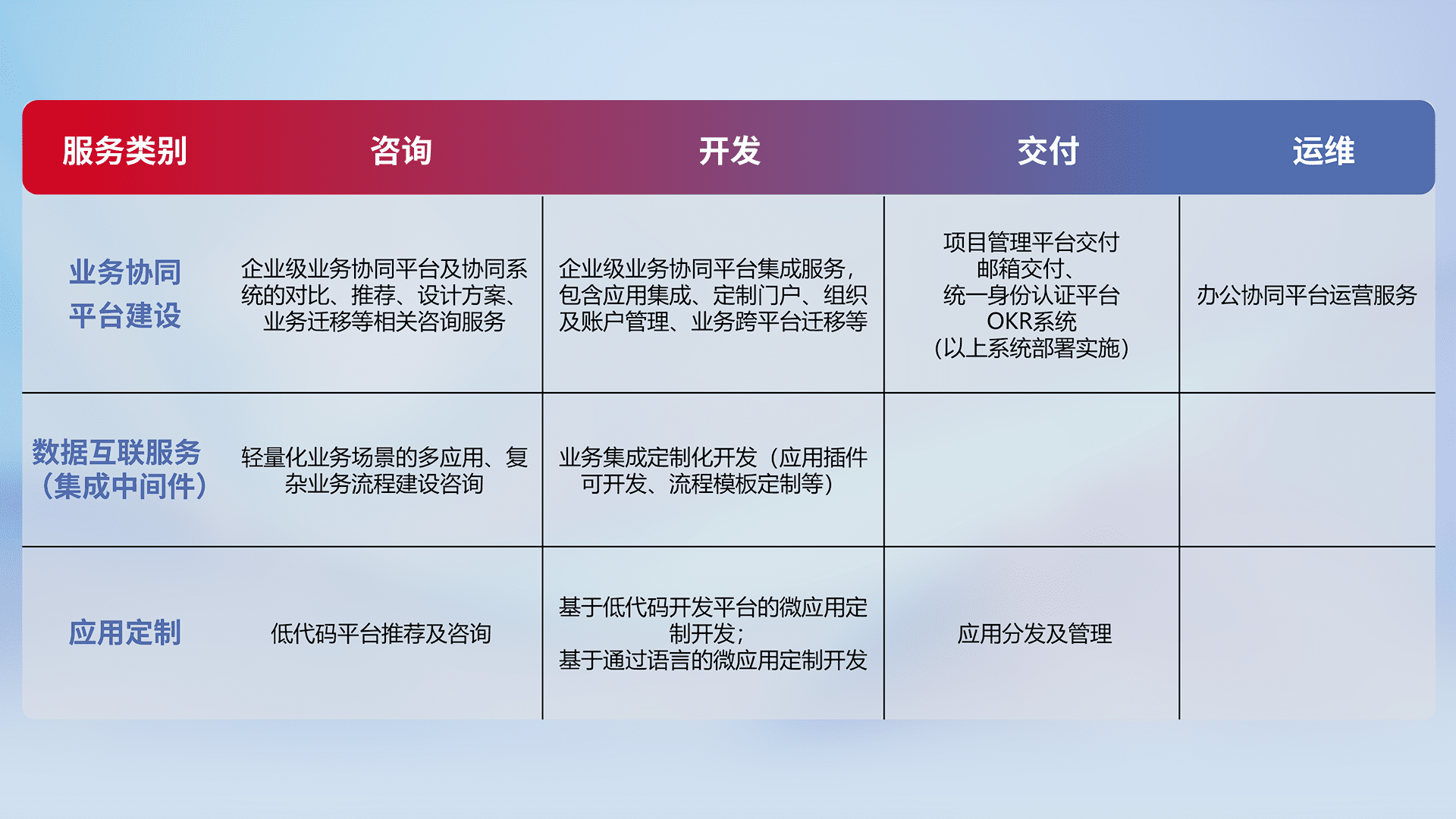 针对钉钉、、、企微、、、、IDaas等平台级产品提供产品的规划、、方案、、、、交付、、、定制化开发等服务,,,实现如统一协同办公、、、、智能客户服务、、混合会议管理、、智能数据查询、、、、等业务场景,,,,实现数字化转型。。。。